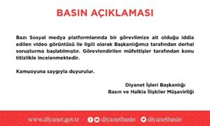 Görüntülerin hızla yayılmasının ardından Diyanet İşleri Başkanlığı’ndan yazılı açıklama geldi. Açıklamada, “Bazı sosyal medya platformlarında bir görevlimize ait olduğu iddia edilen video görüntüsüyle ilgili olarak Başkanlığımız tarafından derhal soruşturma başlatılmıştır. Görevlendirilen müfettişler tarafından konu titizlikle incelenmektedir. Kamuoyuna saygıyla duyurulur.” denildi.